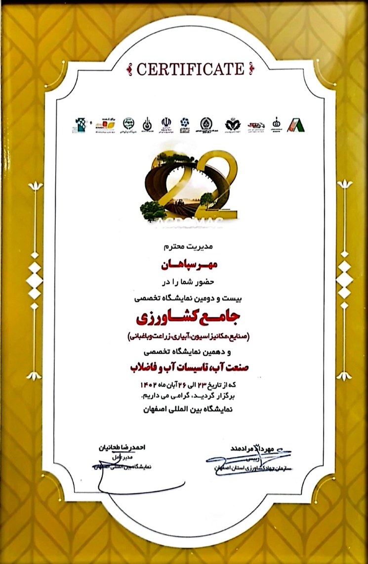 با توجه به گسترش روز افزون کشاورزی و وجود بحران در تامین آب مورد نیاز کشاورزان و در جهت بهره برداری بیشتر و بهتر از منابع آب موجود و با هدف تولید تجهیزات مورد نیاز آبیاری و تامین بازار مصرف ، شرکت مهر سپاهان در سال ۱۳۹0 تاسیس و با توکل بر خدا و بهرهگیری از پرسنل متخصص و کار آزموده و اتکا بر دانش روز و استفاده از تکنولوژیهای مدرن و پیشرفته ، توانسته است با تولید محصولات با کیفیت و مطابق با استاندارهای روز ، علاوه بر در دست گرفتن بخشی از بازار داخلی، محصولات خود را با واسطه، به برخی از کشورهای همسایه ازجمله عراق، پاکستان، عمان و… صادر کند و به عنوان یکی از تولید کنندگان مطرح در زمینه تولید نوارهای آبیاری قطرهای و لولههای پلی اتیلن فعالیت مستمر داشته باشد.